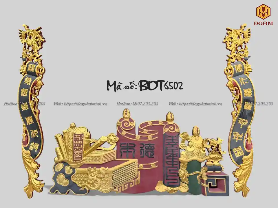 Công Ty Cổ Phần Đồ Gỗ Hải Minh xin giới thiệu khách hàng bộ trâm thư cổ đồ sơn son thếp vàng giả cổ dành cho phòng thờ gia tiên, từ đường.
