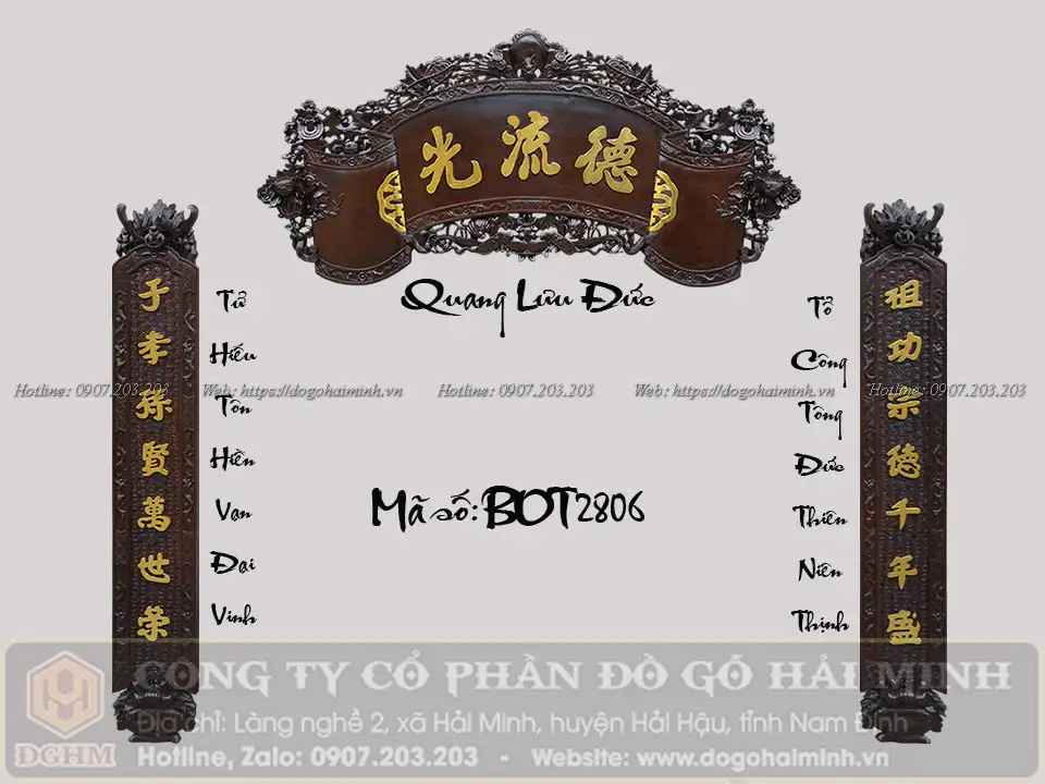 Công Ty Cổ Phần Đồ Gỗ Hải Minh xin giới thiệu khách hàng mẫu cuốn thư câu đối dơi ngậm kim tiền – Mã số: BOT2806, bộ cuốn thư câu đối đục tay dùng trong phòng thờ gia tiên, phù hợp với tất cả mọi người, không kiêng kỵ tuổi tác, là mẫu cuốn thư phổ thông được nhiều người lựa chọn và tin dùng.