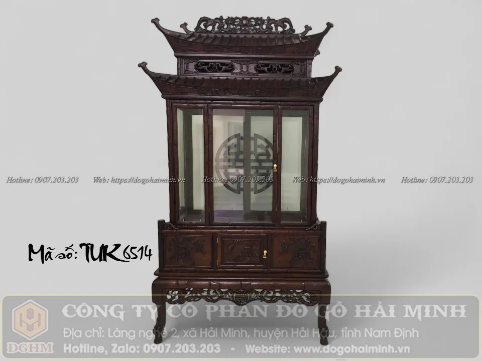 Công Ty Cổ Phần Đồ Gỗ Hải Minh xin giới thiệu khách hàng tủ bày đồ mái chùa làm bằng gỗ gụ Lào mật, tủ lấy ý tưởng từ mái chùa lợp ngói nam cổ kính với nóc tủ là hình ảnh rồng chầu mặt nguyệt, các mái chùa thiết kế cong nhìn rất cổ kính và đẹp mắt.